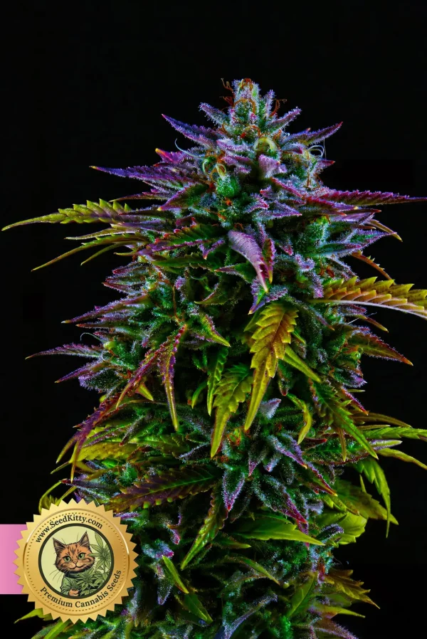 SeedKitty präsentiert stolz die Gushers, eine indicadominierte feminisierte Sorte, die aus einer Kreuzung zwischen Gelato #41 und Triangle Kush hervorgegangen ist. Diese Sorte ist bekannt für ihre Blütezeit von nur 9 Wochen, was sie ideal für Züchter macht, die schnelle Erträge erzielen möchten.